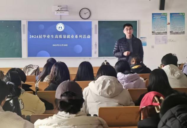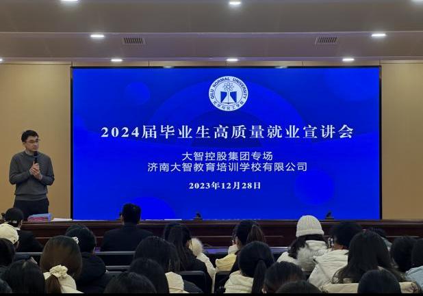 为进一步推进2024届毕业生就业工作,加强学生对当前就业形势的了解,搭建毕业生与企业之间沟通的桥梁,2023年12月28日,学院于二号教学楼A111报告厅、一教A507教室举办2024届毕业生高质量就业宣讲系列活动。参加本次活动有济南大智教育培训学校有限公司人力资源部贾琦、2013届校友周顺发、学院党委副书记巩磊、辅导员梁永鑫及2024届本科毕业生。宣讲会由巩磊主持。