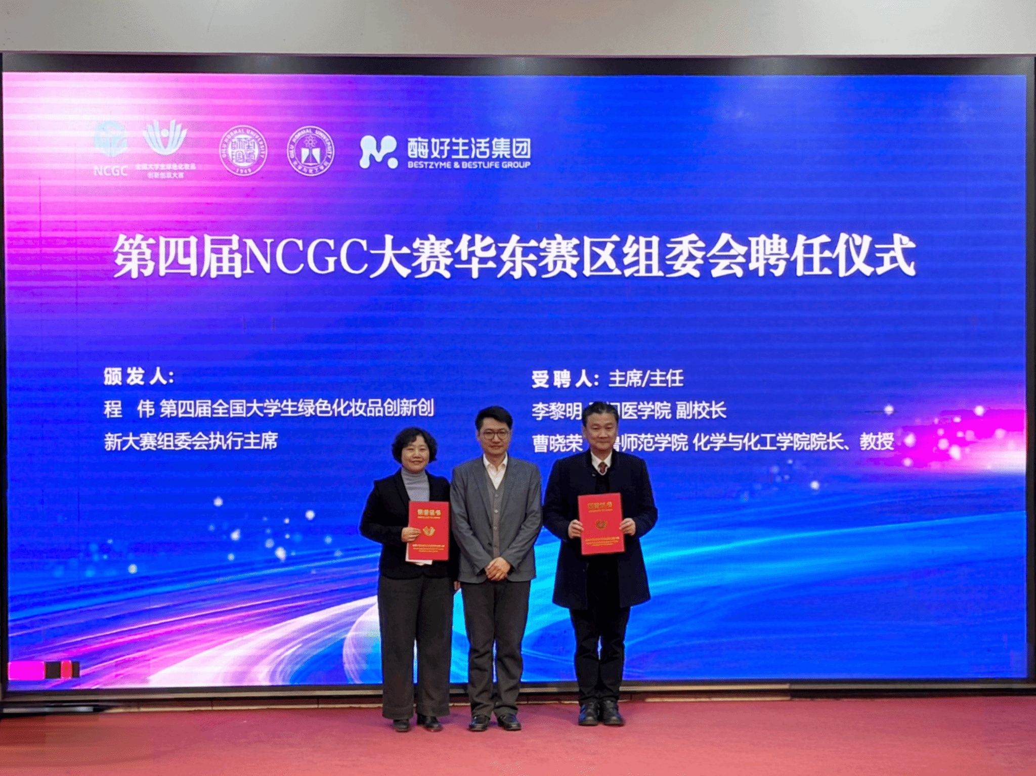 为给大赛提供专业赛事指导与服务,保障赛事各项工作高效开展,第四届NCGC大赛华东赛区组委会设主席/主任2人,副主席/副主任6人,常务委员22人,委员15人,程伟、曹晓荣等为受聘人颁发聘书。同时,程伟、第四届NCGC大赛组委会副秘书长宗东升为酶好生活集团、山东花物堂化妆品股份有限公司颁发合作单位牌匾。