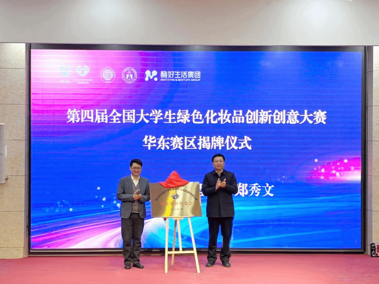 启动仪式上,程伟和郑秀文共同为第四届全国大学生绿色化妆品创新创意大赛华东赛区组委会揭牌。