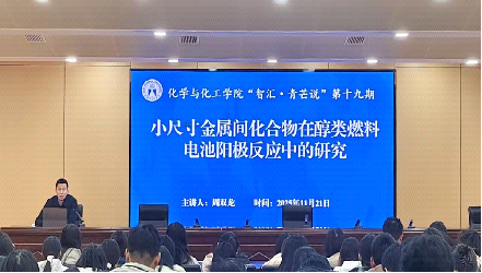 11月21日,学院在章丘校区第二学术报告厅成功举办第十九期“智汇·青芒说”青年博士学术讲座。学院青年博士周双龙以《小尺寸金属间化合物在醇类燃料电池阳极反应中的研究》为题作学术报告,学生代表到场聆听。