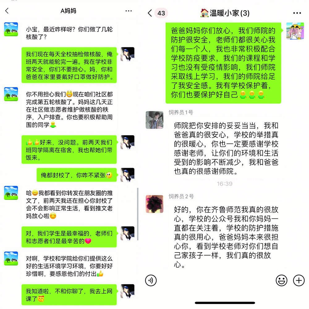莘莘学子求学路,牵动悠悠父母心。为真实反映疫情防控形势下和谐有序的校园生活,向学生家长介绍学校当前强有力的防控措施与全方位的服务保障,做好与家长之间的沟通与联络,学院通过学院官方公众号发布推文和视频,呈现了超市、餐厅、水果店丰富的物资与可口的饭菜,记录了核酸检测、线上教学、志愿服务等一切井然有序,让学生家长们放心。视频发布至今,得到了许多家长的点赞、评论与反馈,2019级化学本科1班穆耶斯尔·阿卜杜凯尤木的妈妈给辅导员发来信息:“了解到学校实施了强有力的防控措施,看到学校里物资齐全,让孩子们在宿舍安全的上网课,我就放心了。感谢学校的领导、辅导员老师,你们辛苦了!”