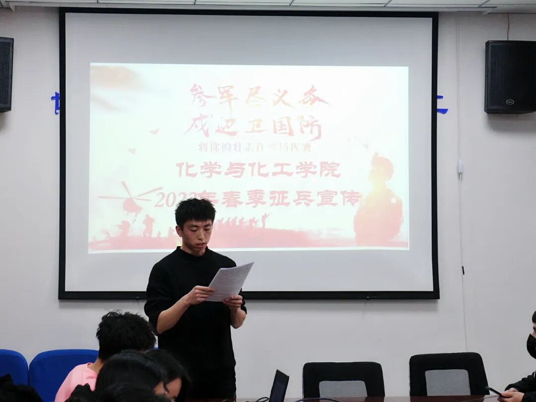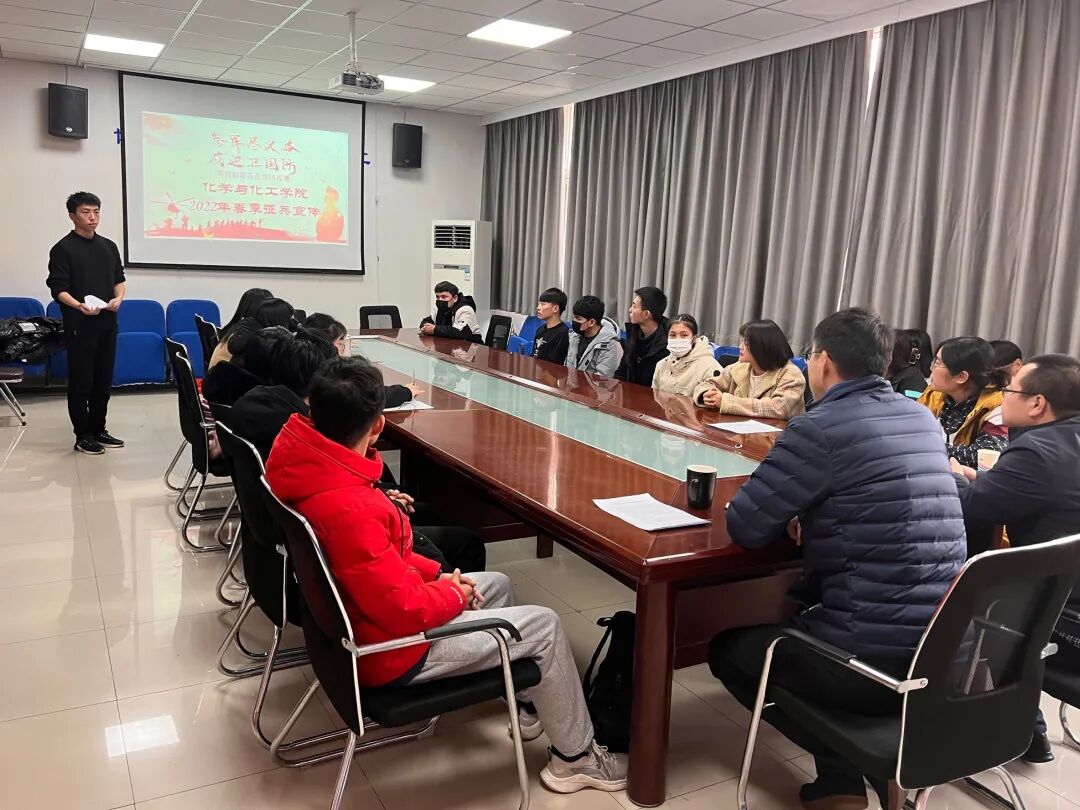为推进我院大学生应征入伍工作,帮助学生了解应征入伍的相关政策和流程,2022年1月4日13:30,我院在实验楼学院会议室B310举行2022年春季征兵宣讲答疑会。参加本次活动的有学生工作部(处)国防教育办公室主任王海涛,国防教育宣讲团成员姚笑笑、马士洋,我院团总支书记巩磊,辅导员邹少爽以及16位有意愿应征入伍的学生。