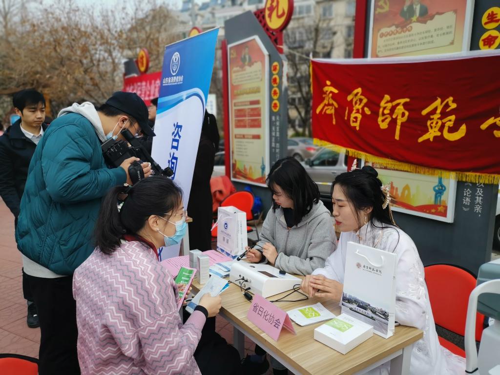 活动当天,我院石聪文副教授、岳立芝老师亲临现场,为广大人民群众开展化妆品质量安全知识宣传。通过科普讲解、接受咨询、发放产品等方式,宣传化妆品质量安全知识,解答消费者日常消费疑难。并就化妆品质量安全问题接受了山东广播电视台农科频道《一切为了群众》与济南广播电视台新闻频道《今晚20分》记者的采访。