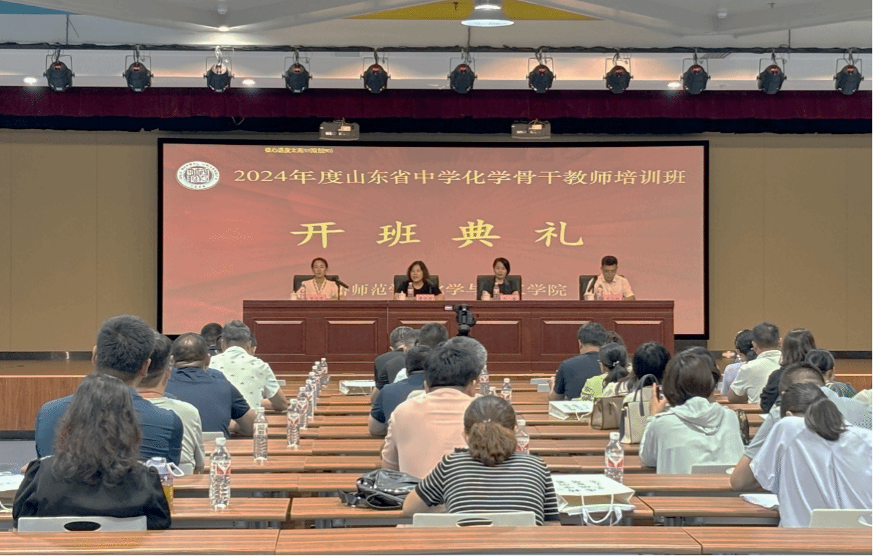 为进一步深化师德师风建设,加强教学基本功训练,全面提升教师在德育、课堂教学、实验操作等方面的执教能力和专业素养,推动我省中学化学教育的持续健康发展,8月14日下午,由齐鲁师范学院化学与化工学院承办的2024年山东省中学化学骨干教师培训班在济南开班。学院院长曹晓荣、培训班首席专家卢巍以及省内众多中学的化学骨干教师齐聚一堂。开班典礼由学院副院长张旭雪主持。