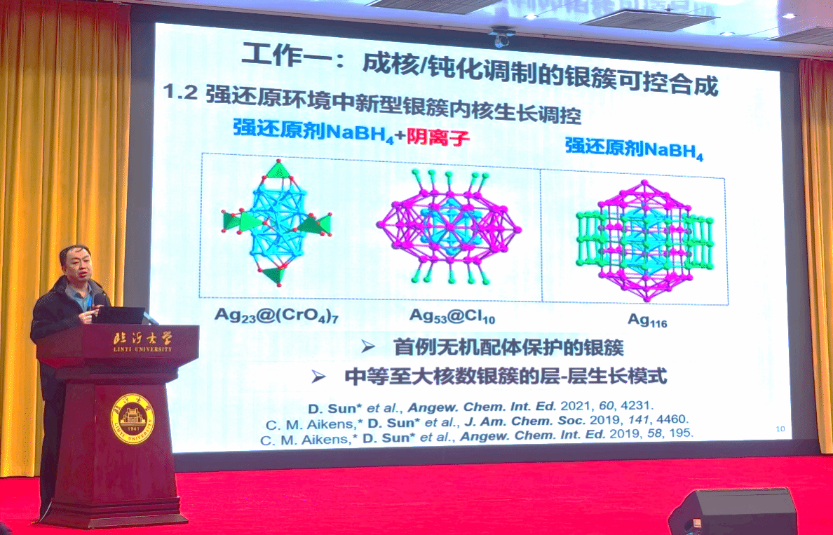 本次论坛汇聚了来自国内多所高校及科研院所的顶尖专家学者,国家杰青、清华大学王定胜教授以《单原子催化》为题介绍了单原子的发展和在催化领域的巨大应用优势和潜力;国家杰青、复旦大学孙忠明教授以《主族团簇化学》为题介绍了主族元素团簇的构建和应用;国家杰青、山东大学孙頔教授以《分级银簇的构筑与演变机制》为题介绍了新颖的分级银簇构筑方法;另外,还有来自北京理工大学,苏州大学、宁夏大学、天津工业大学等国内高校的专家学者做了精彩报告,丰富了本次大会的内容。