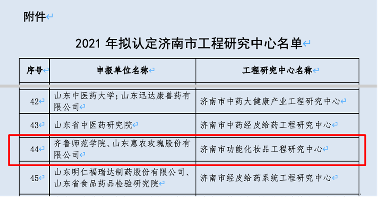 经济南市发展和改革委员会公示,12月15号,学院成功获批济南市功能化妆品工程研究中心。“济南市功能化妆品工程研究中心”是省内第一个功能化妆品领域的市级工程研究中心,由学院牵头,联合山东惠农玫瑰股份有限公共同建设。中心致力于在功效化妆品原料、工艺、分析评价、信息数据库建设几个方面开展研究。针对化妆品行业发展中的重大关键、共性技术问题,开展研发和成果的工程化、产业化,推动化妆品行业领域的技术进步和产业发展。