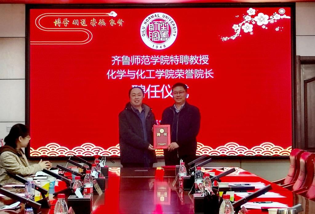 郑秀文对孙頔教授的到来表示热烈欢迎,指出学校高度重视孙頔教授的聘任工作,此次引进交流将为齐鲁师范学院材料与化工硕士点申报、化学学科发展、人才培养及平台建设起到重要的推动作用。郑秀文为其颁发特聘教授聘书及齐鲁师范学院化学与化工学院名誉院长聘书。孙頔教授表示,接下来将紧紧围绕材料与化工专业硕士授予权这一目标开展工作,不断提高学院学科建设水平。