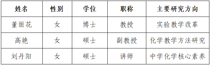 化学教学论教研室现有教师3人,其中博士1人,硕士2人。职称方面,教授1人,副教授1人,讲师1人。