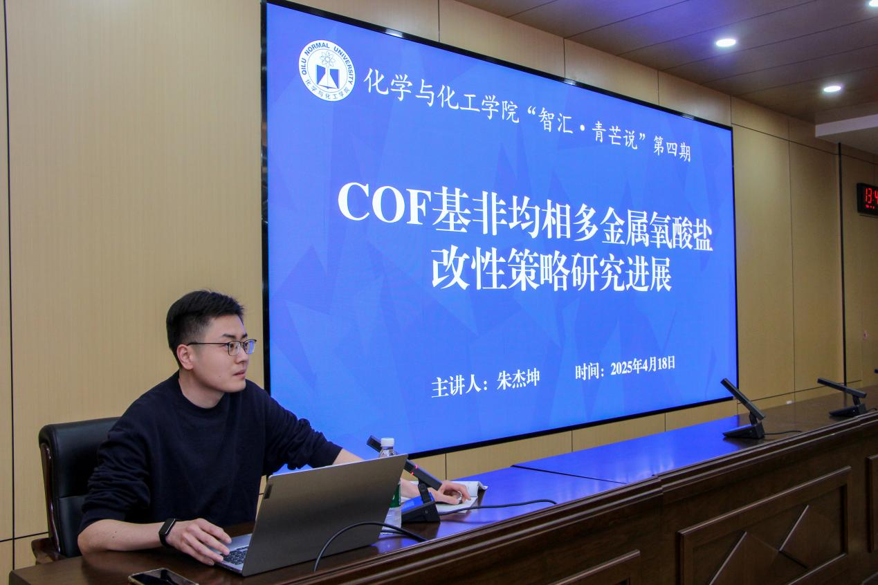 4月18日,学院在二号教学楼A111成功举办第四期“智汇·青芒说”青年博士学术讲座。学院青年博士朱杰坤以《COF基非均相多金属氧酸盐改性策略研究进展》为题作学术报告,学生代表到场聆听。
