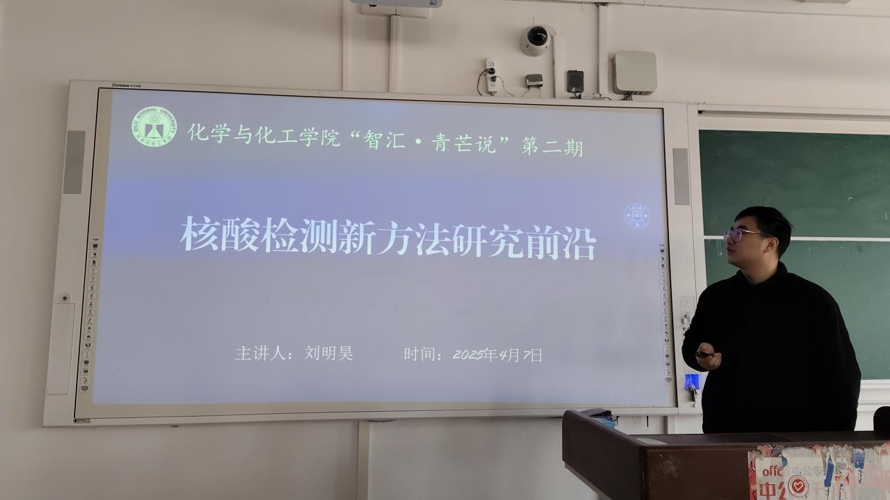 4月4日,化学与化工学院在章丘校区一号教学楼A405成功举办第二期“智汇・青芒说”青年博士学术讲座。学院青年博士刘明昊以《核酸检测新方法研究前沿》为题做学术报告,学生代表到场聆听。