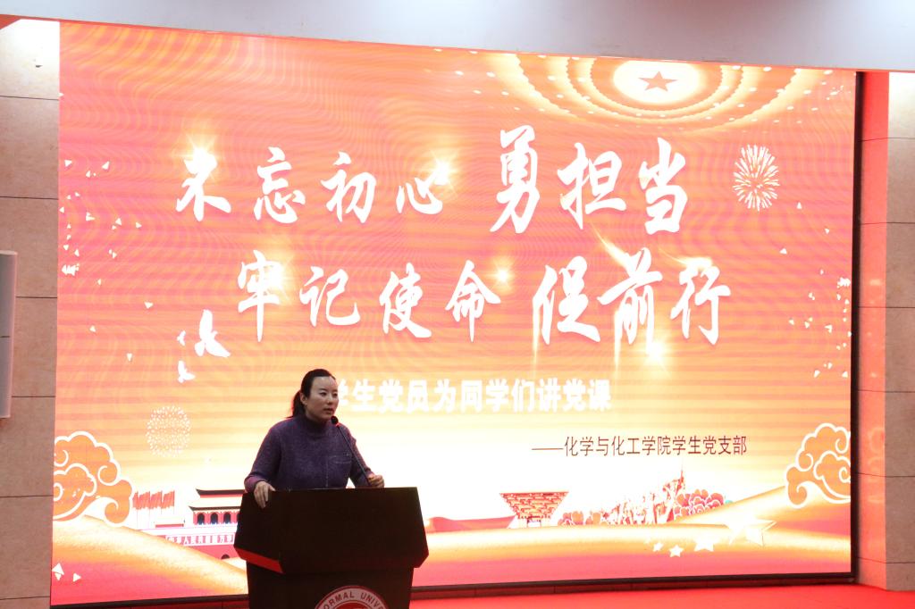 为加深同学们对党员的理解以及对中国共产党领导下新时代的认识,2019年11月18日晚18:00,化学与化工学院于图书馆学术报告厅开展了以“不忘初心勇担当,牢记使命促前行”为主题的学生党员讲党课活动。本次活动由我院学生党支部书记李钰茜主持,我院学生党员、2018级入党积极分子代表和2019级全体新生参加了本次活动。