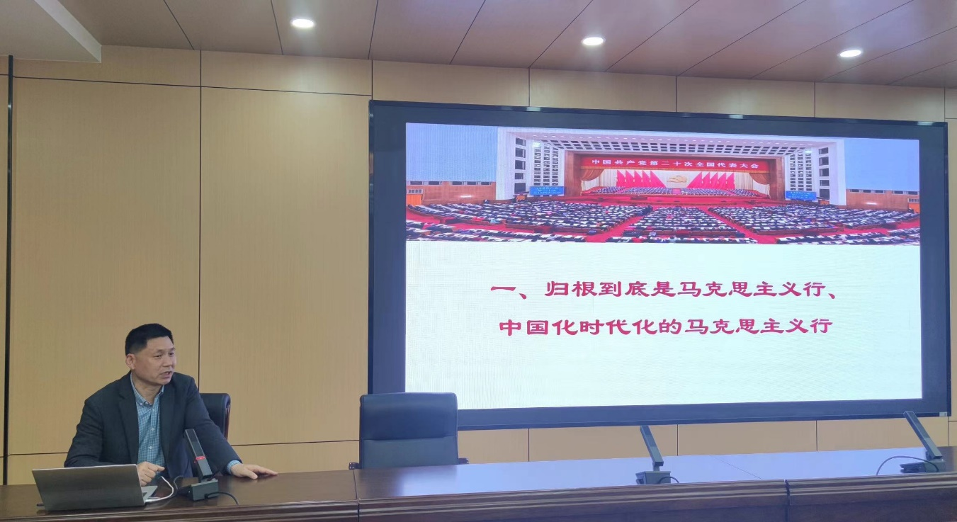 会上,戚桂峰教授围绕“归根到底是两个行”、国内外形势新变化和实践新要求、“坚持“两个结合”的根本途径、习近平新时代中国特色社会主义思想的主要内容、开辟马克思主义中国化时代化新境界五个方面深入浅出地进行讲解。他以纵贯古今的大历史观透彻分析了马克思主义中国化的历史脉络、演进轨迹,以中西对比的方法清晰揭示了习近平新时代中国特色社会主义思想是顺应“国内外形势新变化和实践新要求”的理论结晶,以详细的数据、生动的视频深刻阐释了“两个结合”的对象、方法、意义、成效等重大理论问题,展现了古今贯通、中西贯通、政学贯通、事理贯通的鲜明特色。他讲到,要从习近平总书记的思考和探索中感悟思想伟力、汲取真理力量,不断增进对习近平新时代中国特色社会主义思想的政治认同、思想认同、理论认同、情感认同,做到至信而深厚、融通而致用、执着而笃行。