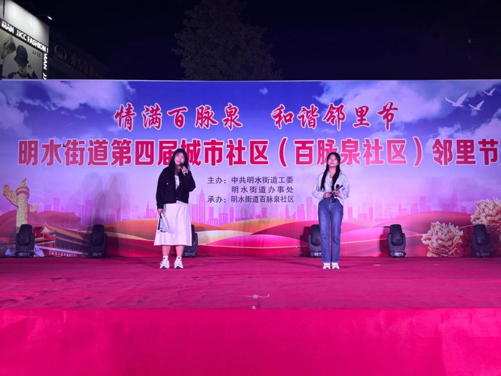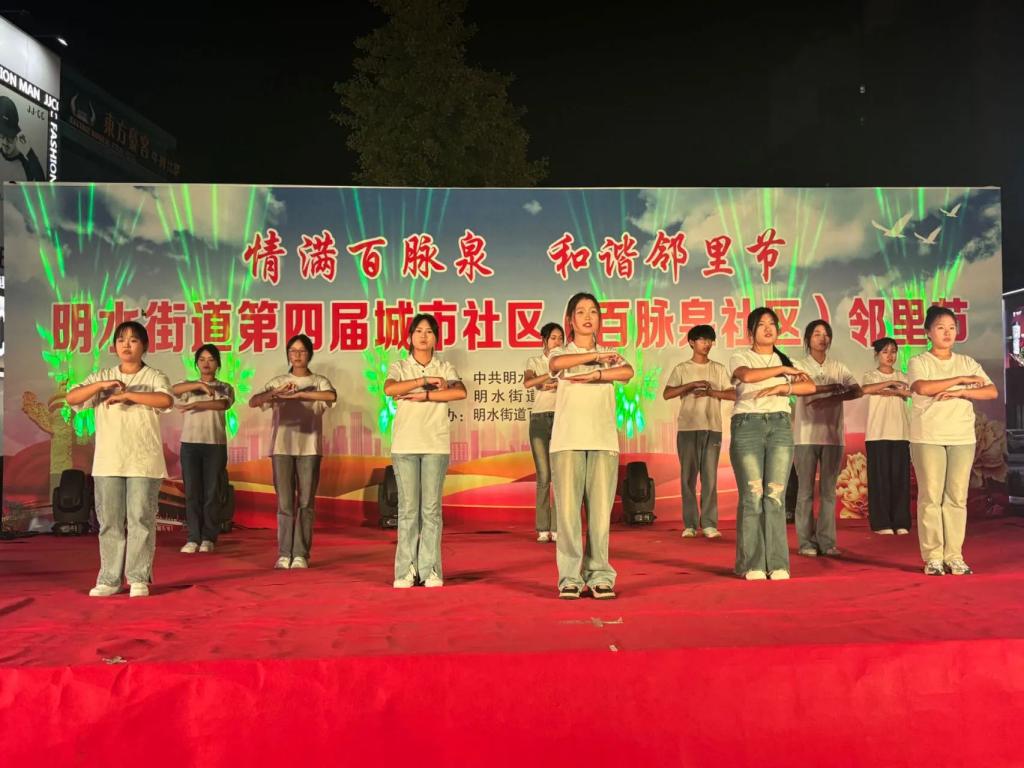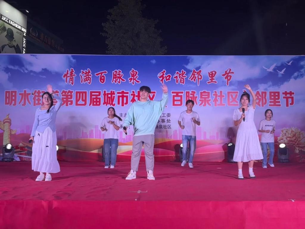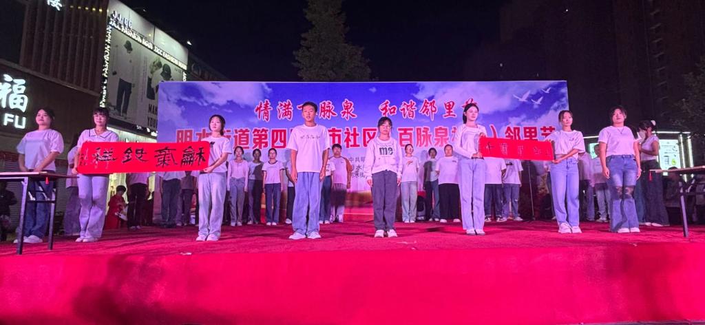 晚上,百脉泉社区志愿文艺活动精彩纷呈,吸引了大批居民观看。本次活动以“欢乐迎国庆,情满百脉泉”为主题,52名学生志愿者表演了《上春山》《我的未来式》《明天你好》《青花瓷》四个节目,为居民们带来了一场视觉与听觉的盛宴,丰富了社区居民的文化生活,增进了邻里间的情感交流。