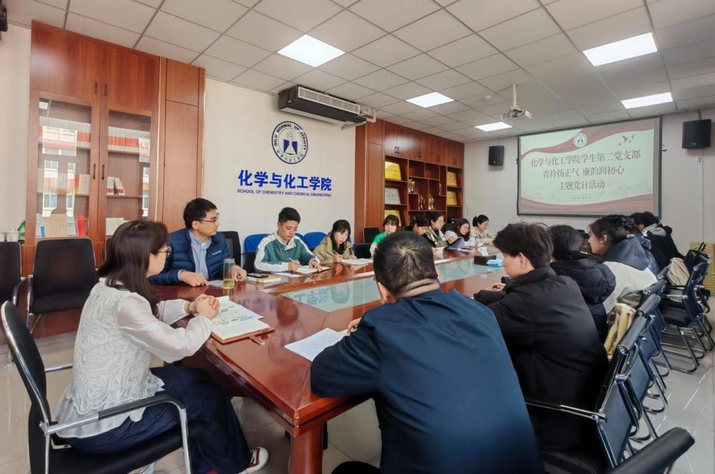 为开展深入贯彻中央八项规定精神学习教育,锤炼党员崇俭戒奢、清正廉洁的作风修养,学院学生第二党支部于3月31日在学院会议室组织开展了“青衿扬正气,廉韵润初心”主题党日活动。化学与化工学院学生第二党支部全体师生党员参加。学院党委书记巩磊列席指导本次活动。活动由党支部书记杨睿主持。