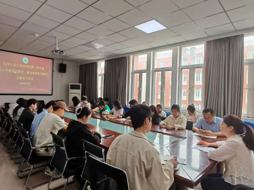 为开展深入贯彻中央八项规定精神学习教育,持续加强党员作风建设,化学与化工学院学生第二党支部于5月23日在学院会议室开展了“深入开展学习教育,持续加强作风建设”主题党日活动。学生第二党支部全体师生党员参加,部分入党积极分子列席。活动由党支部书记杨睿主持。