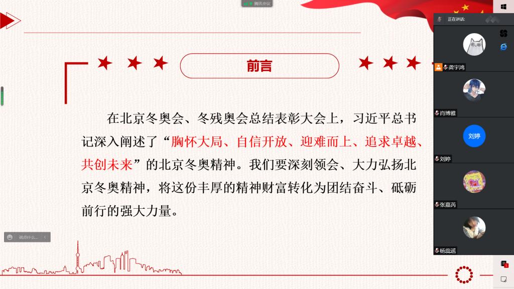 4月8日,北京冬奥会、冬残奥会总结表彰大会在北京人民大会堂隆重举行。学院迅速掀起学习热潮,其中,2019级、2021级各团支部开展了以“弘扬北京冬奥精神,凝聚青春奋进力量”为主题的政治学习。此次学习采用“云会议”的方式进行,按照“1+4”的模式从新视界、习语录、学榜样和心互动四个环节展开,从学习总结表彰大会中习近平总书记重要讲话精神,到回顾冬奥赛场上的高光时刻,再到感受台前幕后志愿者们的青春力量,帮助同学们进一步理解了北京冬奥精神,引导同学们树立积极乐观、自立自强、阳光自信的生活态度,形成热爱体育、崇尚运动的良好风气。