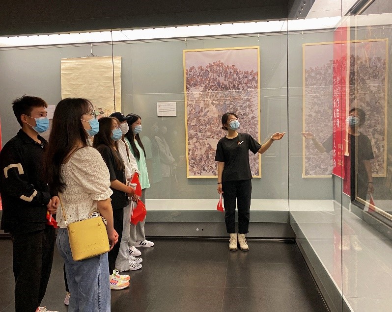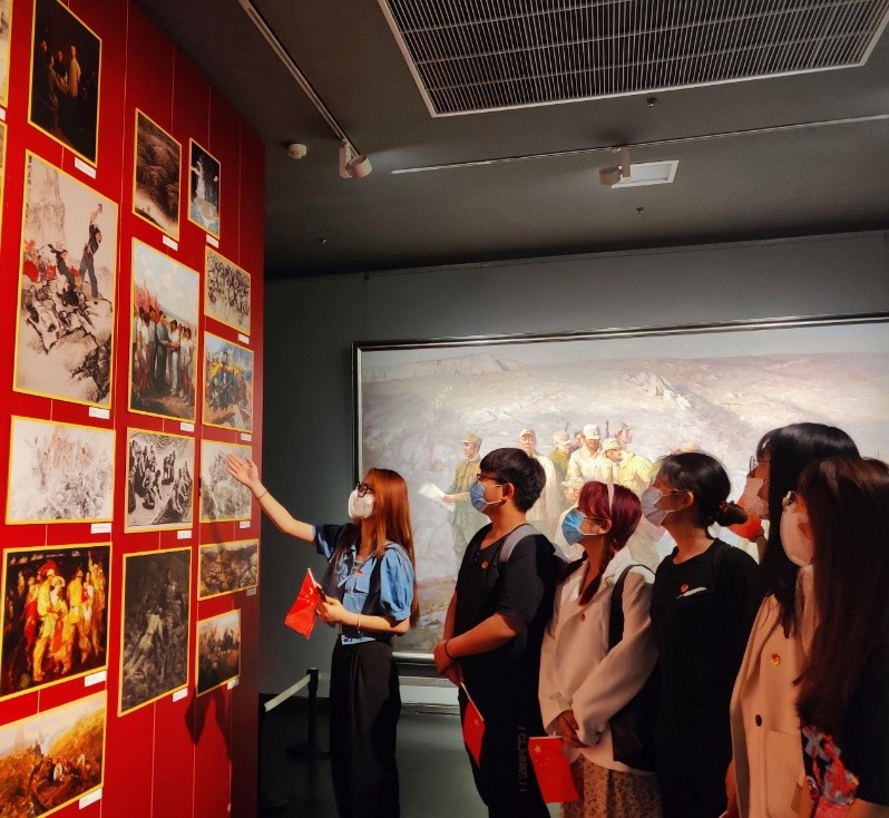 赏画展,展宏图。进入展馆后,全体成员以小组为单位欣赏艺术作品,从思想性、时代性对作品进行深刻的解读。一幅幅作品,一张张图片,一个个画面,向同学们展现了中国共产党带领人民筚路蓝缕、艰苦奋斗的伟大壮举,呈现了中国共产党在中国特色社会主义道路前进过程中的光荣历程,体现了中国共产党在中华文明进程中的历史担当。