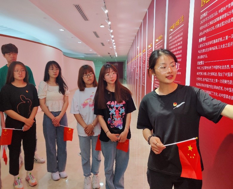 知党史,铭初心。上午九点半,2019级药品生产技术四班团支部全体成员抵达山东省美术馆,走进四楼,一面红色大事件墙以时间为轴展现在同学们眼前,再现了中国共产党一个世纪的伟大进程。在红色大事件墙下,团支书孟祥蕾向同学们介绍中共一大至十九大的主要内容、历史意义,让同学们对党的百年历史有了深刻的理解和认识,引领同学们在即将开始的参观中主动学习作品背后生动鲜活的党史故事,弘扬作品展现的不屈精神。