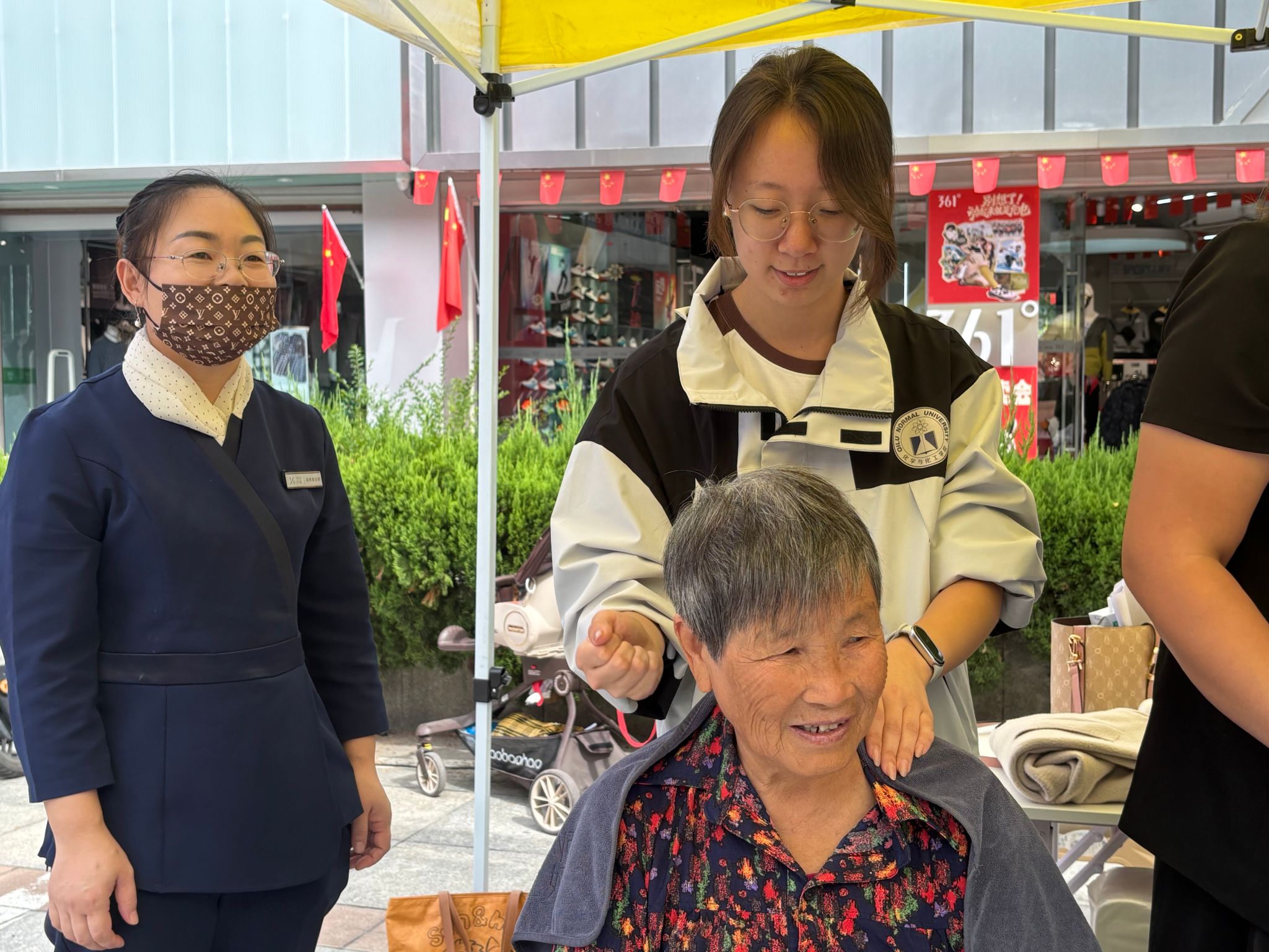 上午,邻里节公益市集活动开始。志愿者们在现场健康诊疗、爱心义剪、美容按摩等13项惠民体验活动高效开展服务活动,迅速完成帐篷搭建、横幅张贴、物资搬运等场地布置工作,为活动顺利开展提供了有力保障。他们分工明确、各司其职,在各个点位热情服务:他们娴熟地协助师傅磨剪刀、戗菜刀,让居民家中的厨具焕然一新;在宣传服务摊位,他们通过大喇叭循环播报活动内容,并发放宣传资料,耐心解答居民咨询;义诊区域内,他们耐心登记测血压信息表,维持现场秩序,协助医护人员开展健康科普。整个活动现场气氛热烈,志愿者们用细致周到的服务赢得了社区居民的一致好评。