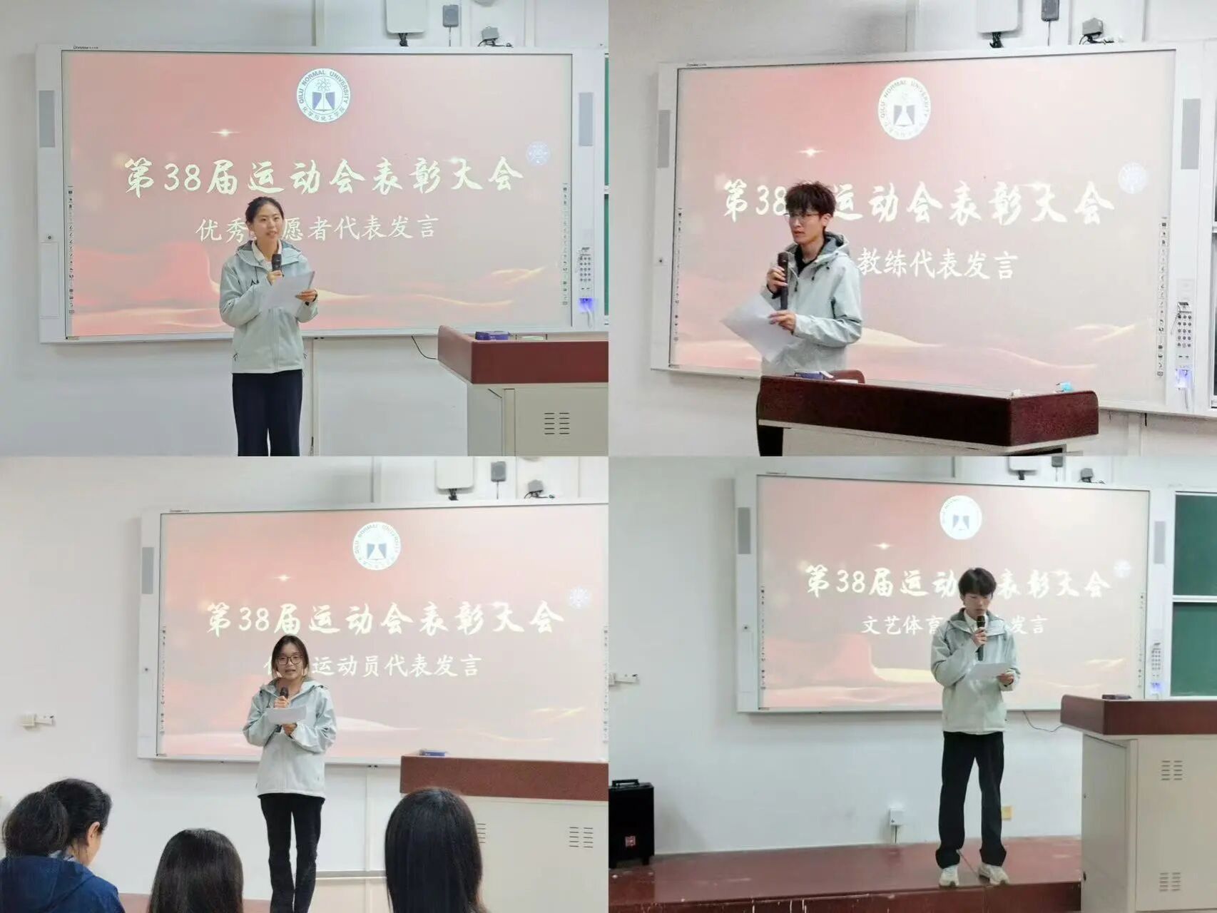 颁奖环节后,四位学生代表依次上台发言,分享运动与服务中的感悟。优秀运动员代表齐可欣讲述了训练与比赛中的挑战与成长,传递“拼尽全力便无遗憾”的信念;优秀志愿者代表纪晶华分享了服务过程中的感动,诠释“奉献也是一种收获”的意义;运动员教练代表刘存涛回顾了带领队员备战的点滴,展现“同心协力,共筑目标”的团队精神;学生会体育部代表刘宏泽总结了赛事组织经验,表达了“以体育凝聚力量,以活动焕新活力”的决心。真挚的发言引发全场共鸣,掌声阵阵。