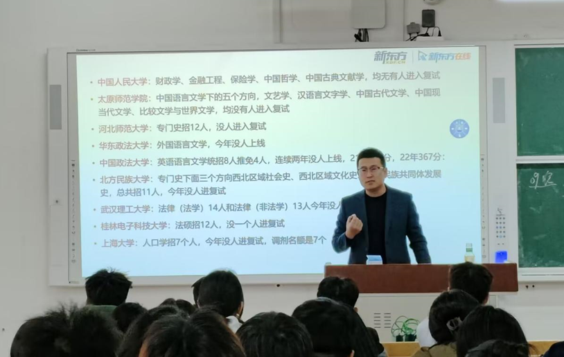 为加强学风建设,充分调动学生考研积极性,帮助学生了解考研形势,明确考研目标,10月24日,学院在一号教学楼举办考研宣讲会,特邀新东方王伟康老师担任主讲,辅导员王海涛、张袭妍老师出席,2025年、2026年考研学生参加宣讲活动。