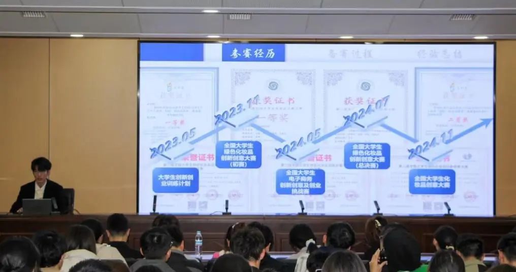 “朝乾夕惕,功不唐捐。”栗敏从全国大学生绿色化妆品创新创意大赛、全国大学生化妆品创新创意大赛、“华灼杯”第四届全国高校化妆品产品设计及创新大赛这三个赛事介绍她的参赛经验,她点明比赛对个人成长的重要价值,并勉励更多同学参与此类赛事。