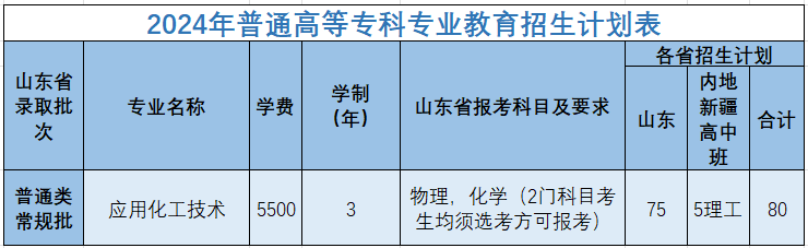 应用化工技术专业创建于1998年6月,2008年11月被评为山东省高等学校特色专业。该专业面向地区经济和社会发展,培养具备化学与工艺方面的理论知识和基本技能,在化工、医药等行业企业从事化工生产操作、工艺及质量控制、技术管理、安全生产等工作的高级应用型人才。