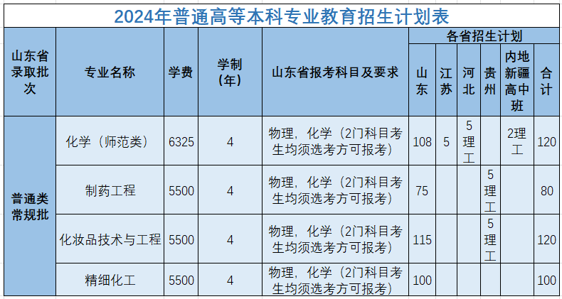 化学与化工学院现有化学、制药工程、化妆品技术与工程、精细化工、应用化学5个本科专业以及应用化工技术专科专业。2008年应用化工技术专业获批省级特色专业、2019年化学专业获批山东省一流专业建设点,2022年新设化妆品技术与工程专业为“四新”专业,2024年新设精细化工专业为“四新”专业。学院被教育部授予“全国教育系统先进集体”荣誉称号。
