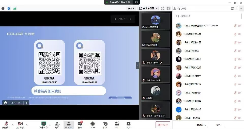 2023年3月17日,我院邀请克劳丽化妆品股份有限公司(苏州)开展线上招聘会。参加本次会议的有质量管理中心总监胡添、运营与人力资源部副总监王苏生、招聘调配部经理李婷婷、团总支书记杨睿以及2019届本科毕业生。