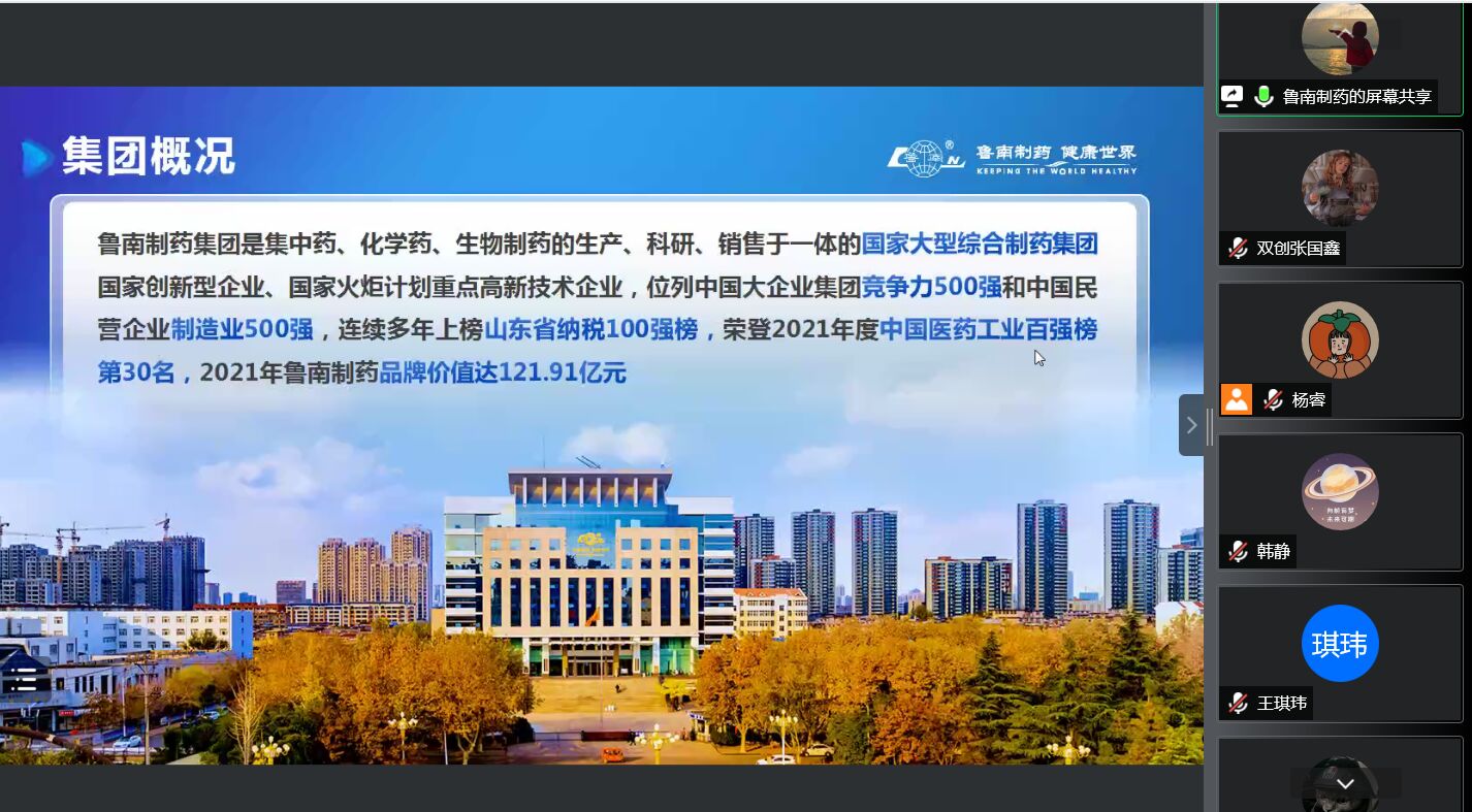 会议伊始,杨睿对鲁南制药集团在学院进行专场招聘宣讲表示欢迎,并对鲁南制药集团作了简要介绍。她指出,鲁南制药集团是集中药、化学药品、生物制品的生产、科研、销售于一体的综合制药集团,是一家与学院长期保持密切联系的用人单位,每年都有优秀的毕业生进入鲁南制药集团工作并取得了突出的工作业绩。