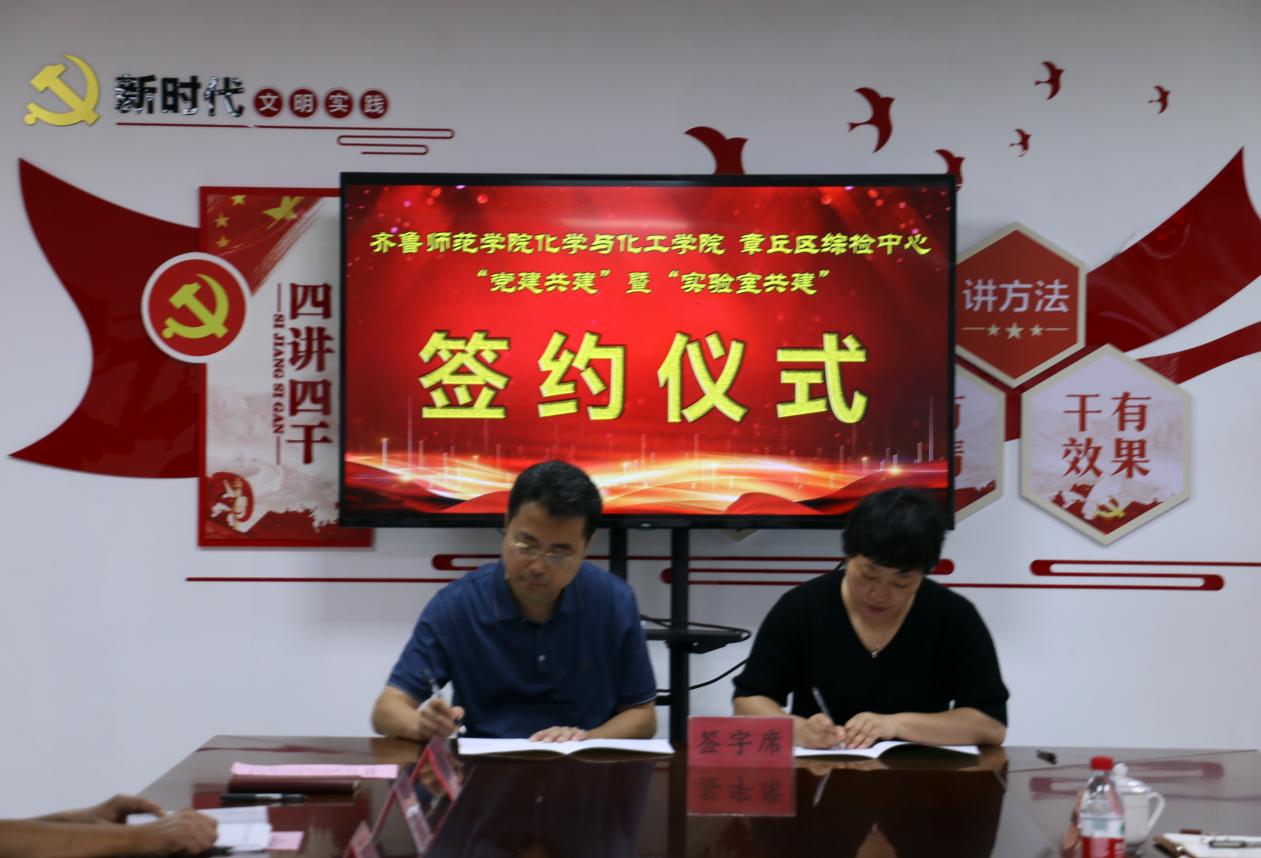 为深入贯彻党的二十大精神,扎实开展学习贯彻习近平新时代中国特色社会主义思想主题教育,全面推进基层服务型党组织建设,更好地为地方经济建设和社会发展服务,近日,学院与章丘区综检中心开展“党建共建”暨“实验室共建”活动。学院党委书记郭百灵,党委副书记、院长曹晓荣,党委副书记巩磊,副院长张旭雪及章丘区综检中心党组书记、主任张鹏,章丘区综合检验检测中心中层干部等参加签约仪式。