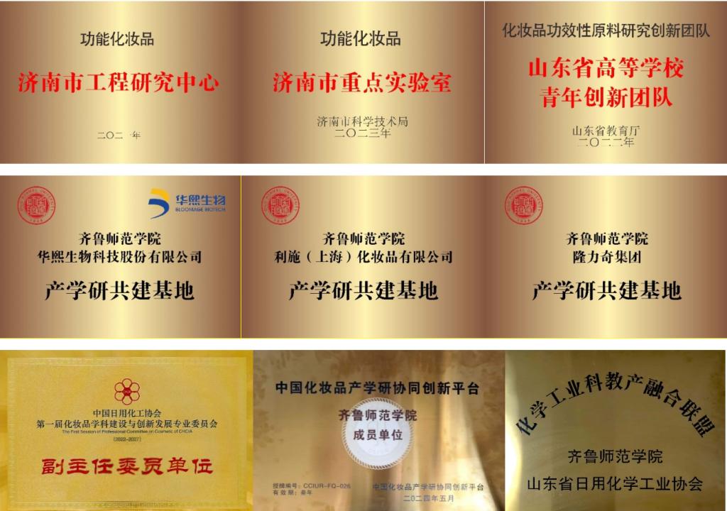 中心建立有机、无机合成及表征实验室、工艺过程模拟及优化实验室、化妆品原料研究室、分析检测中心、毒理分析实验室、功效评价实验室等,科研仪器设备资产总值达1500万元。中心于2017年、2019年、2021年通过山东省质量技术监督局、山东省药品监督管理局、中国合格评定国家认可委员会审核,获批化妆品检验检测资质机构,具备非特化妆品备案CMA和CNAS资质;2021年获批济南市功能化妆品工程研究中心;2023年获批功能化妆品济南市重点实验室、济南市第二批市校融合发展战略工程项目(化妆品专业人才培养与产教融合平台建设);2023年加入中国日用化工协会化妆品学科建设与创新发展专业委员会,获批成为副主任委员单位;2024年获批中国化妆品产学研协同创新平台成员单位。同时,搭建化妆品内外包材展示公益平台,引进60余家国内外知名化妆品外包材企业,对外展示近千余种满足各类护肤品和彩妆产品需求的、各类材质的内外包材和工艺产品。
