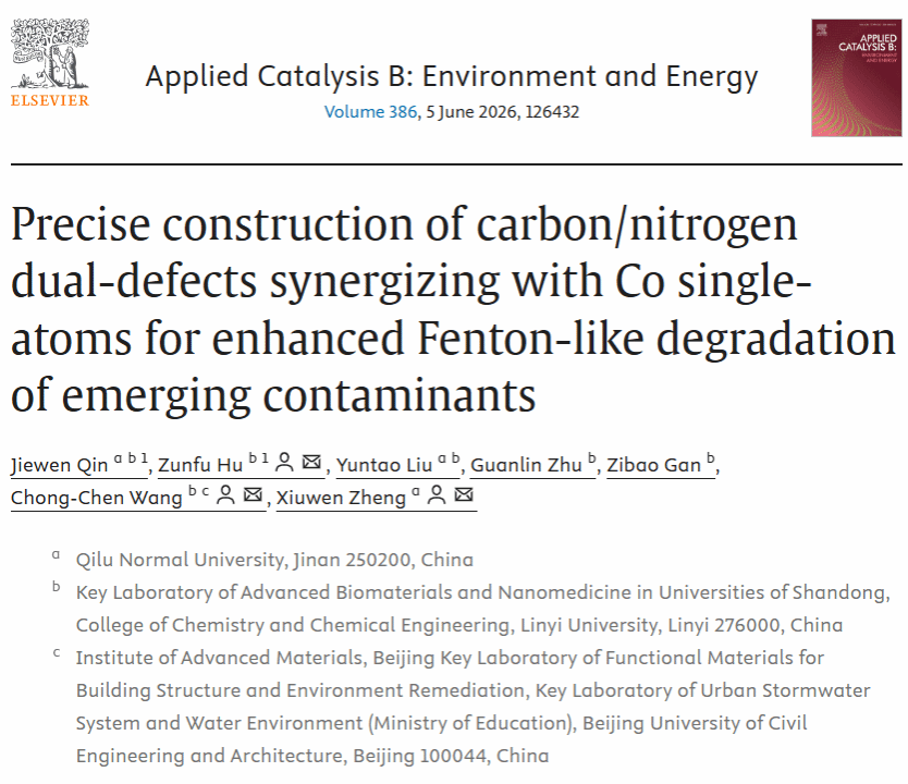 近日,学院郑秀文教授团队在国际知名期刊《Applied Catalysis B: Environment and Energy》(中科院生物学1区TOP期刊,五年影响因子20.2)上发表了题为《Precise Construction of Carbon/Nitrogen Dual-Defects Synergizing with Co Single-Atoms for Enhanced Fenton-like Degradation of Emerging Contaminants》的研究成果,聚焦钴单原子活性中心结合碳/氮双缺陷(VC,N)的氮化碳催化剂活化PMS降解对乙酰氨基酚研究,开辟了有机物协同降解新机制。