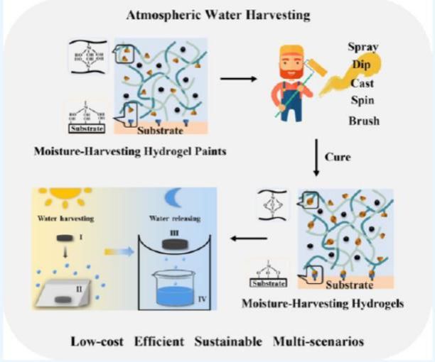 ①以丙烯酰胺和丙烯酸的共聚物作为支撑骨架,并向其中添加掺杂氯的聚吡咯纳米复合物以及可潮解盐,通过硅烷偶联剂交联,在不同应用场景下制得不同尺寸的吸湿凝胶涂层或吸湿凝胶块,用于高效的大气吸湿。该成果发表在ACS Applied Polymer Materials, 2023, 5, 9063−9075.