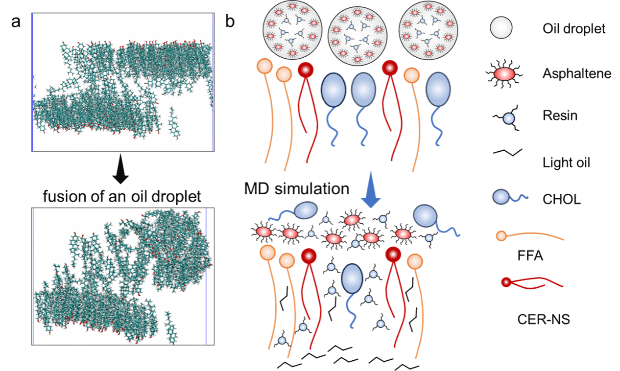 ④构建了典型原油-皮肤界面模型,从分子层面揭示原油组分如何逐步削弱皮肤屏障功能。呈现了原油多组分对皮肤屏障的协同破坏机制,明确了轻质油分子的主渗透角色与胆固醇逃逸在结构破坏中的核心作用。上述发现不仅深化了对皮肤屏障损伤机理的理解,也为原油暴露后的皮肤保护策略(如胆固醇补偿、界面屏障强化剂设计)提供了重要理论指导。该成果发表于Langmuir, 2025, 41, 47, 31890-31899。