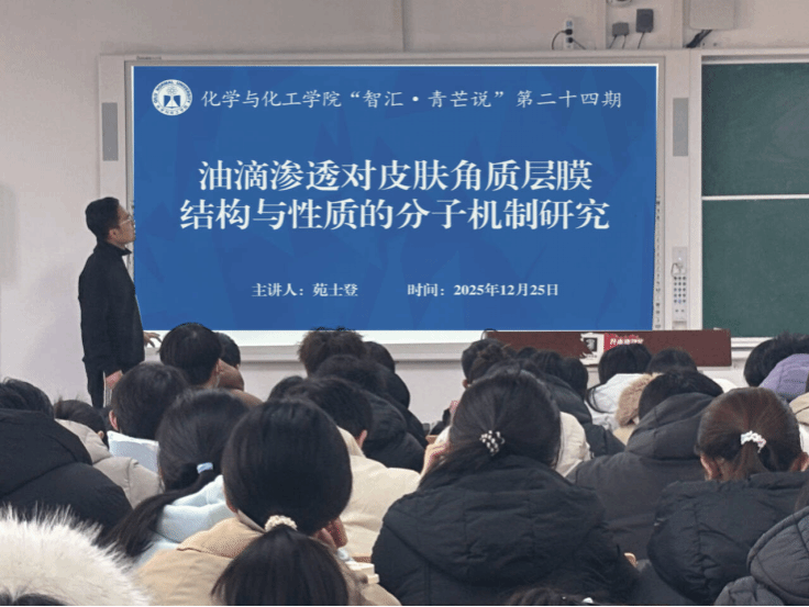 12月25日,学院在齐鲁师范学院章丘校区一号教学楼A302成功举办第二十四期“智汇·青芒说”青年博士学术讲座。学院青年博士苑士登以《油滴渗透对皮肤角质层膜结构与性质的分子机制研究》为题作学术报告,学生代表到场聆听。