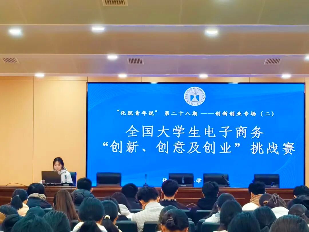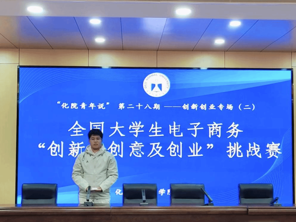 为进一步激发学生参与电子商务领域创新创业赛事的热情,帮助学生将专业知识与电商实践深度结合,培育具备创新思维、商业视野和实战能力的高素质人才,11月29日下午,学院“化院青年说”第二十八期创新创业专场活动在第二学术报告厅举行。本次活动聚焦全国大学生电子商务“创新、创意及创业”挑战赛(简称“三创赛”),学院学生会双创部干事范筱煜、秦留洋做赛事宣讲,邀请2024级化妆品技术与工程三班施雨璐分享参赛实战经验,2024级精细化工二班贺鹏志担任活动主持人。