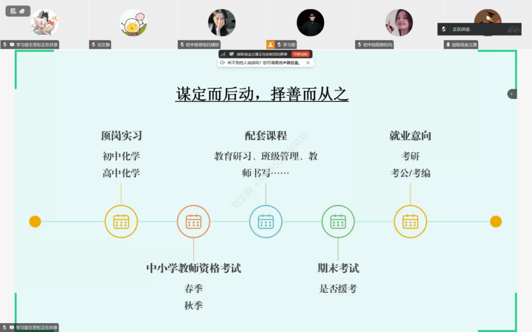 为加强学风建设,充分发挥优秀学生的示范引领作用,帮助师范生更全面的了解山东省师范类高校学生从业技能大赛,8月30日19:00,学院举办了第二十六期“化院青年说”大学生朋辈经验交流会。第十三届山东省师范类高校学生从业技能大赛二等奖获得者2022级化学专业韩昀均,三等奖获得者2022级化学专业金立晟、任婧妍、张新月、耿绍飞作经验分享。2023级全体师范生参加了本次活动。