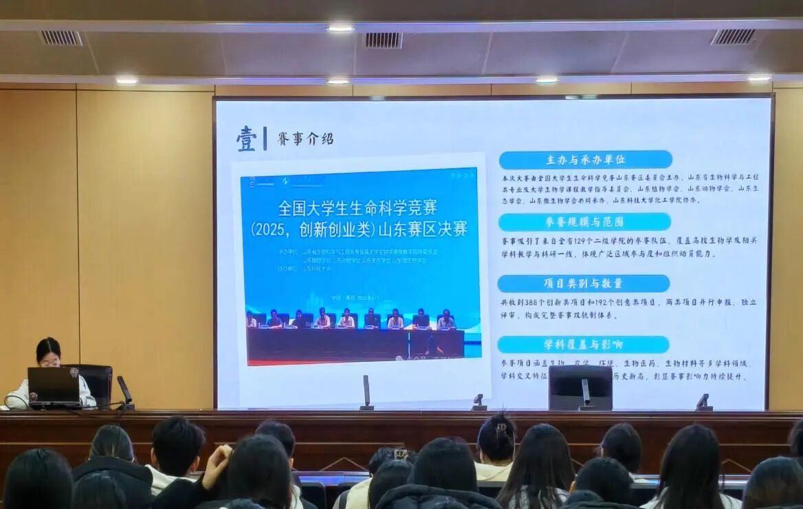 贺鹏志结合化学与化工专业特色,从赛事定位、报名流程、备赛要点、核心价值四大维度展开宣讲。他介绍,“挑战杯”作为国家级A类赛事,采用三级赛制,化工类项目可重点布局技术驱动型、产业赋能型选题,鼓励跨学科组队搭配双导师指导;全国大学生生命科学竞赛则设科学探究与创新创业双赛道,强调学科交叉与实验实操。他展示了学院在两项赛事中的获奖作品,提醒同学们避开“选题空泛、分工模糊、材料不规范”等常见问题,建议大家积极请教指导老师、找准选题、把握核心要素。