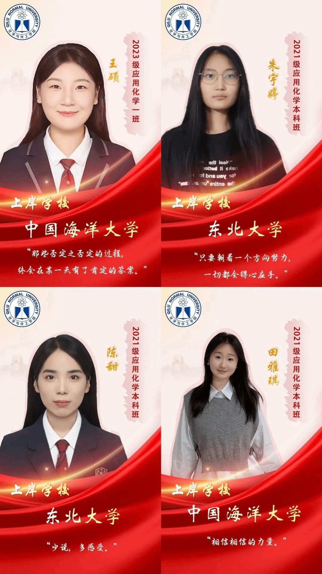 升学与就业:近年来,学院考研率位列学校前茅,连续被评为齐鲁师范学院学风建设先进集体。近三年本科生平均考研率44.40%,多名学生被西安交通大学、山东大学、中国海洋大学、爱丁堡大学等国内外知名高校录取,985、211院校录取比例逐年增加。多名毕业生在山东省中小学以及华熙生物、隆力奇、福瑞达、润丰化工、鲁南制药等知名企业就业,深受用人单位好评。多年来,学院总体升学/就业率均在90%以上,连续被评为齐鲁师范学院就业先进集体。