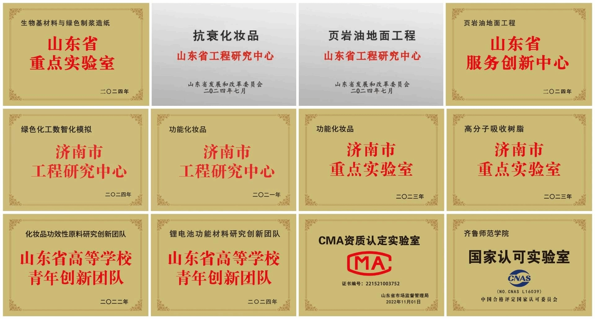 实验室与平台建设:学院拥有功能完善、设施先进、管理合理的实验室,建筑面积约4000m²,大型仪器设备总价值3700余万元。学院形成了以化学新师范教育和应用型新工科人才培养为特色的学科专业建设布局。现有山东省生物基材料与绿色制浆造纸重点实验室、抗衰化妆品山东省工程研究中心、页岩油地面工程山东省工程研究中心、山东省页岩油地面工程服务创新中心4个省级平台,绿色化工数智化模拟济南市工程研究中心、功能化妆品济南市工程研究中心、济南市功能化妆品重点实验室、济南市高分子吸收树脂重点实验室4个市级平台。学院分析检测中心具备非特化妆品备案,化妆品、化妆品原料、生态环境固体废物毒理CMA、CNAS检验检测资质,服务全国57个省市400余家企业。学院平台对所有学生开放,助力学生科研和实践能力的培养。